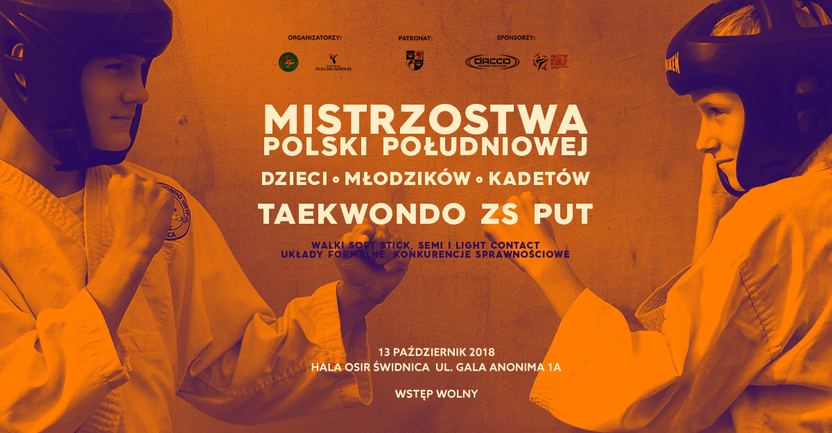Zachęcamy wszystkie dzieci, młodzików i kadetów (zawodnicy od 6 do 15 lat) do wzięcia udziału w Mistrzostwach Polski Południowej w Taekwon-do ZS PUT, które odbędą się 13 października w Świdnicy.