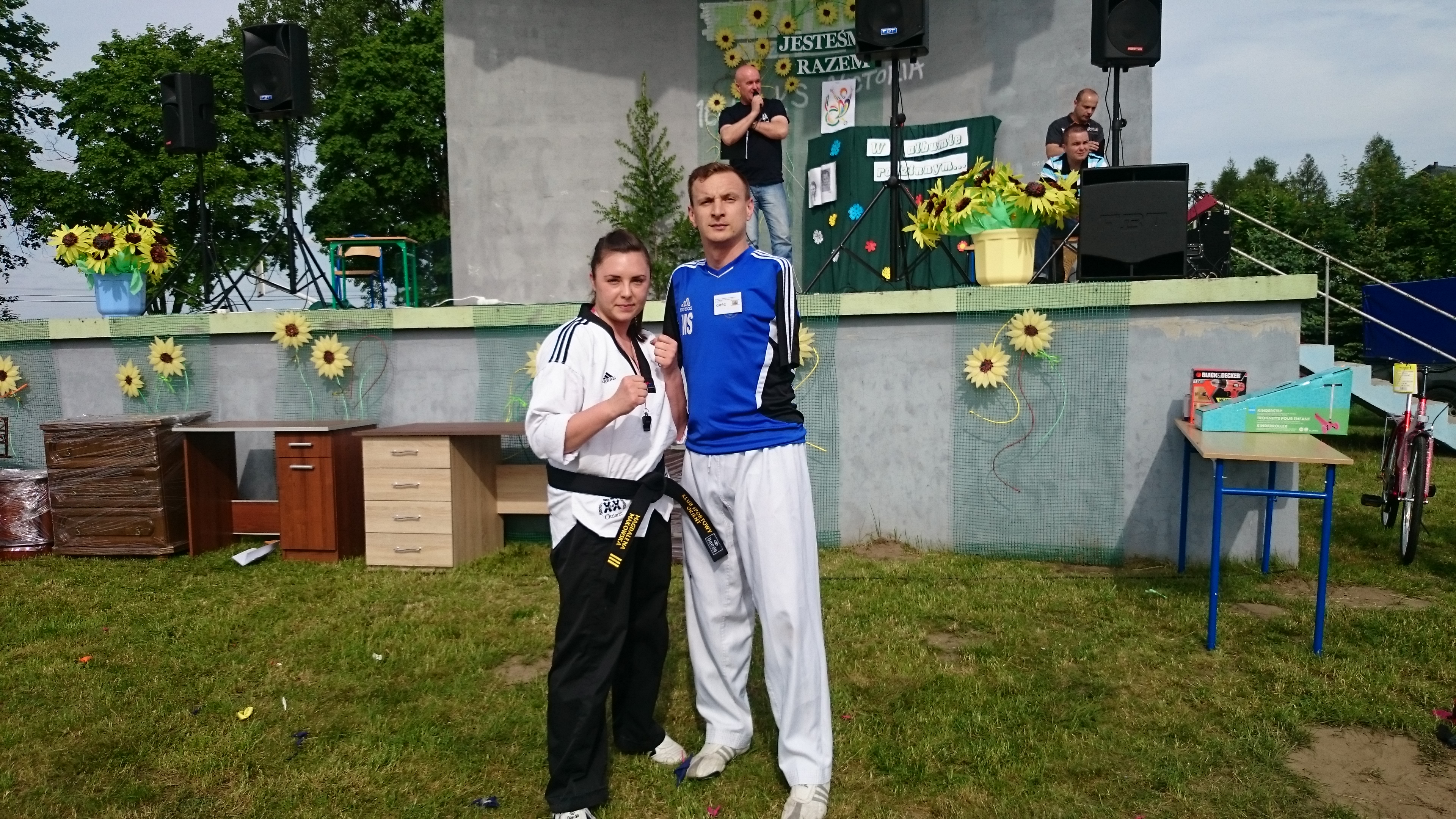 Przemek zaprosił instruktorkę Magdalenę Makowską do krótkiego wspólnego występu – pokazu technik taekwondo wykonywanych na tarcze i packi. Nie obyło się bez najbardziej efektownych elementów, jakim są rozbicia desek.