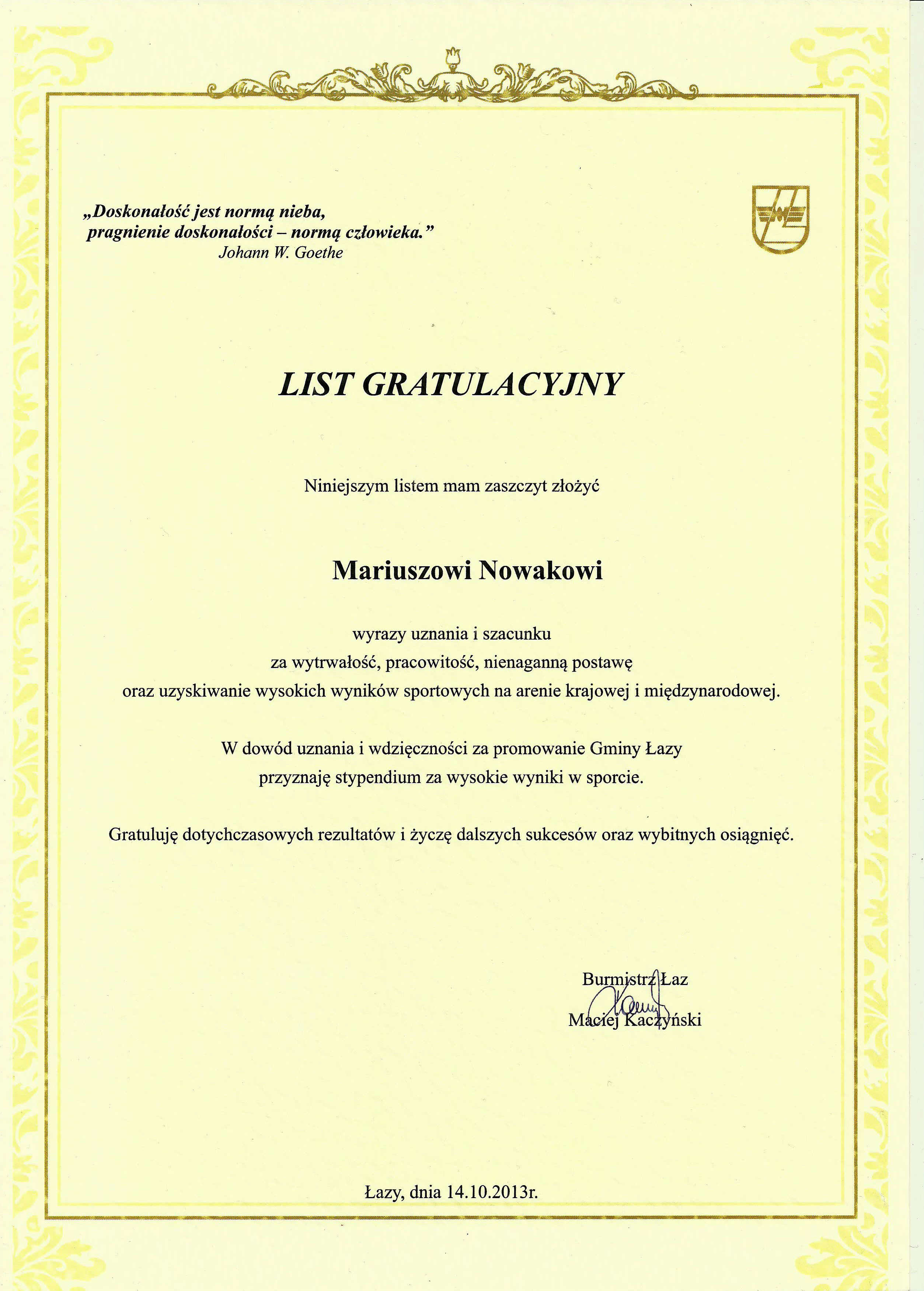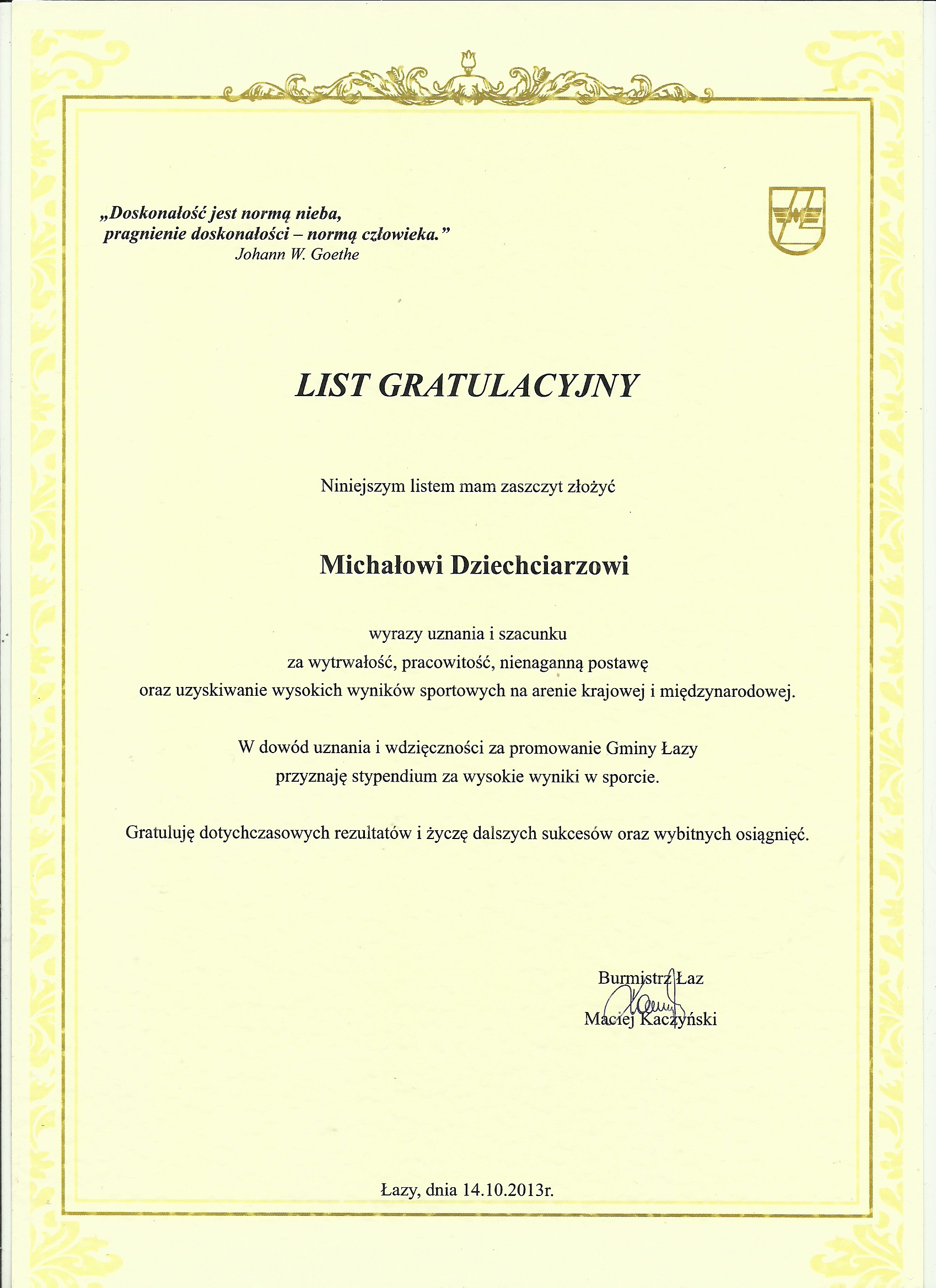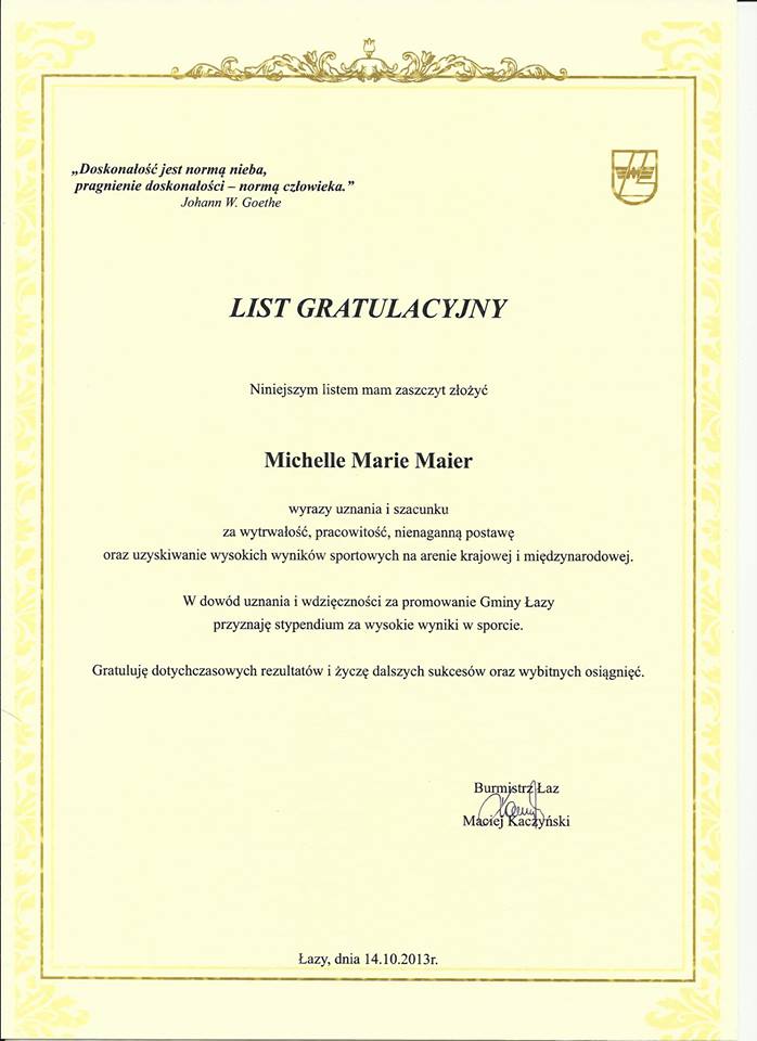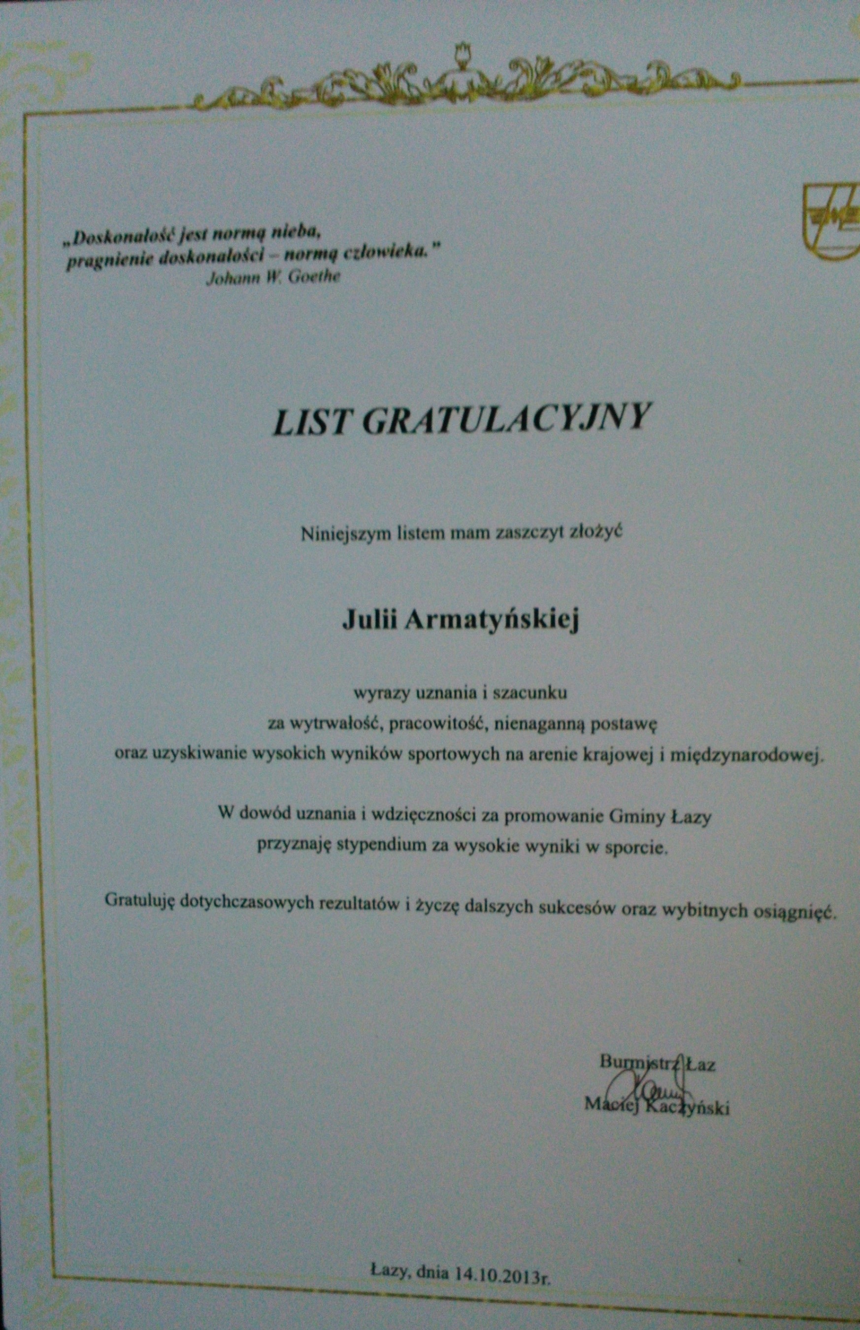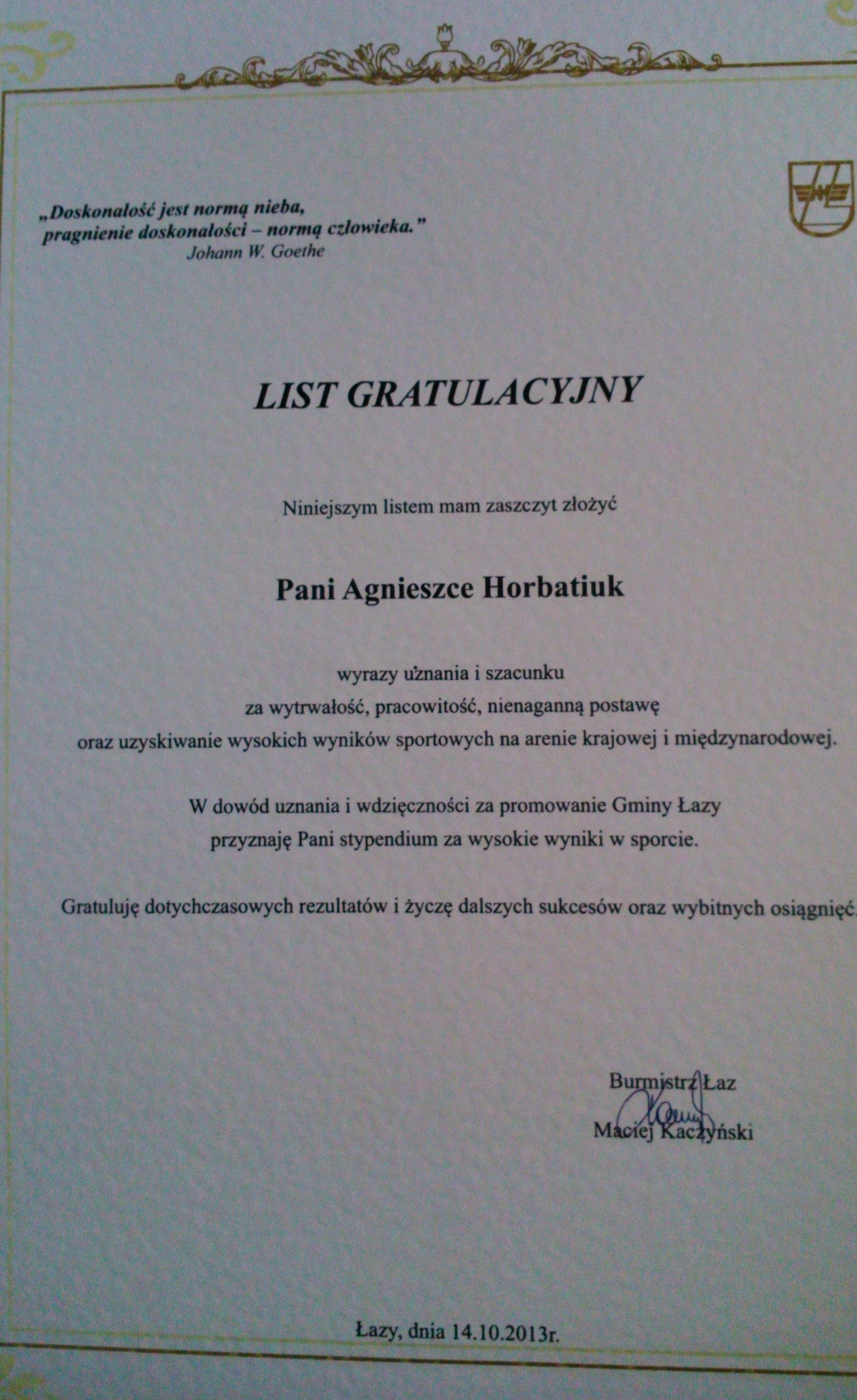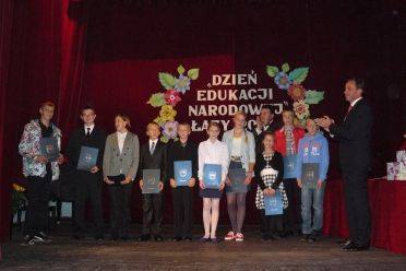 Łazy, Miejski Ośrodek Kultury, Dzień Edukacji Narodowej, 14.10.2013r.- zawodnicy i instruktorka Klubu Sportowego „Orient” otrzymali listy gratulacyjne z rąk Burmistrza Łaz.