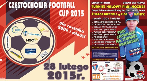 Serdecznie zapraszamy w niedzielę 1 marca do Hali Sportowej Zespołu Szkolno – Przedszkolnego w Kamyku przy ulicy Szkolnej na Charytatywny Piłkarski Turniej Halowy. Całość dochodu z imprezy zostanie przeznaczona na leczenie Filipa Sulińskiego. Organizatorem zmagań, których początek został wyznaczony na godzinę 9.00, jest Stowarzyszenie Kibiców Wieczny Raków. Podczas turnieju do nabycia będzie również cegiełka w cenie 10 złotych.